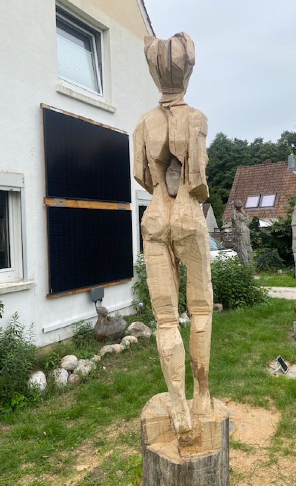 Es zeigt meine entstandene Skulptur "Freiwurf", Eiche, Höhe ca. 2,3 Meter